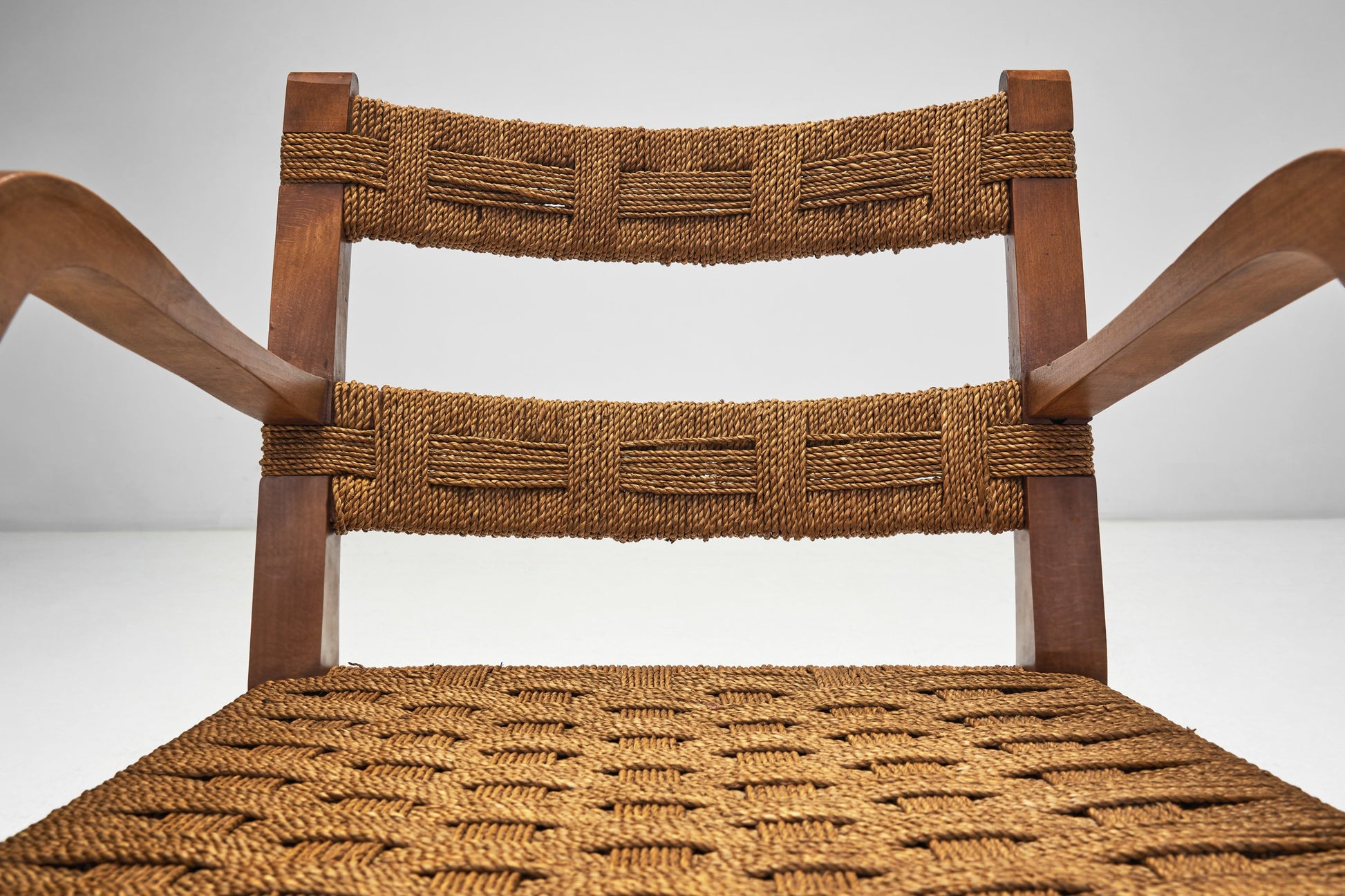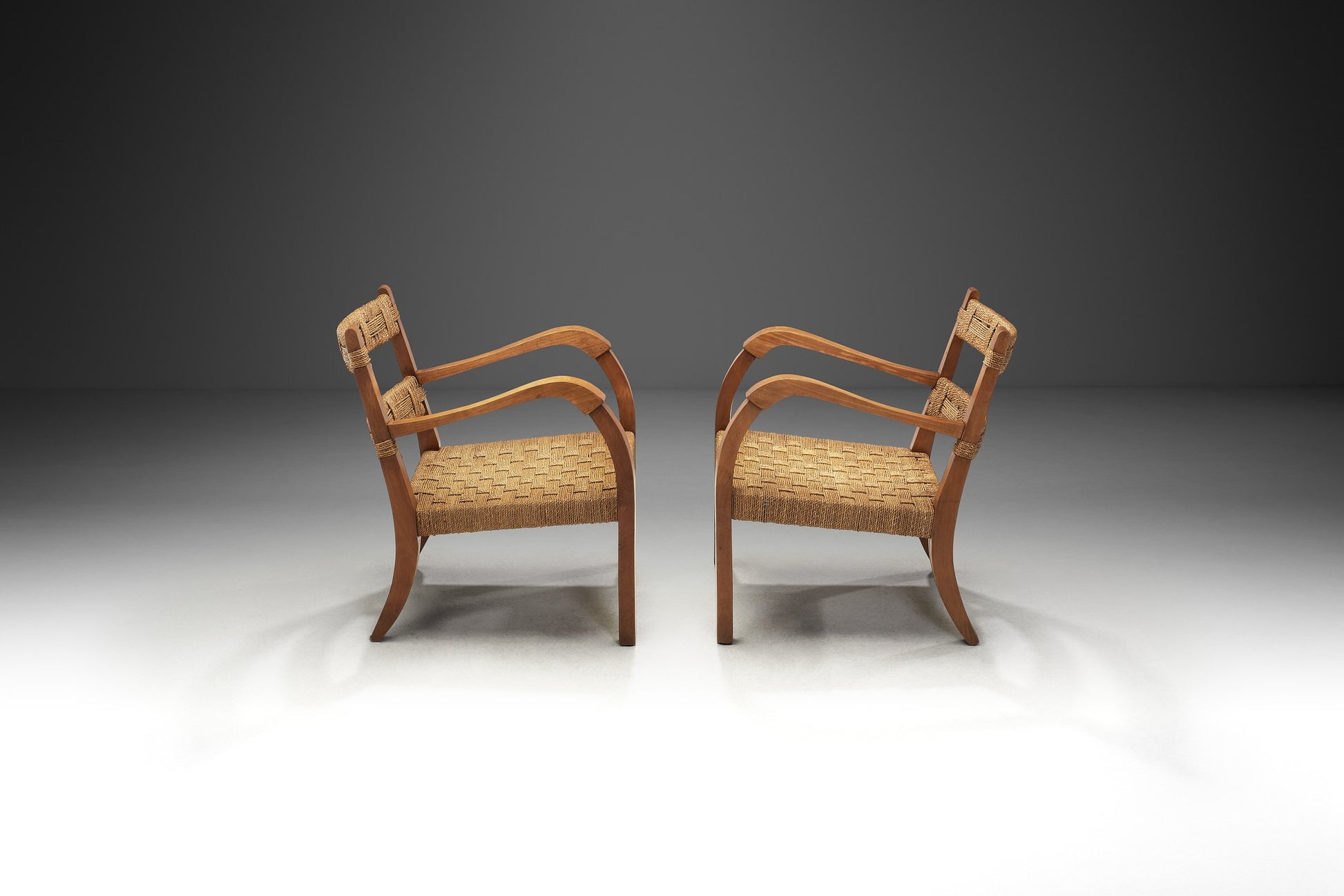 Price category: 7,500–10,000 USD / EUR. Pair of Italian armchairs, mid-20th century, combining style, balance, and craftsmanship. Featuring woven rattan backs and seats within sturdy wooden frames, the design contrasts graceful curves and arched armrests with the grid-like rattan weave. The interplay of texture, lightness, and warm brown tones enhances their visual depth, while the slightly reclined seats ensure comfort without upholstery. Exemplifying the golden era of Italian design, these chairs serve as both functional seating and decorative art. In good vintage condition with age-consistent wear. Dimensions: 56 × 64 × 68.5 cm; seat H 34 cm; seat D 49 cm; arm H 58 cm (22" × 25" × 27").