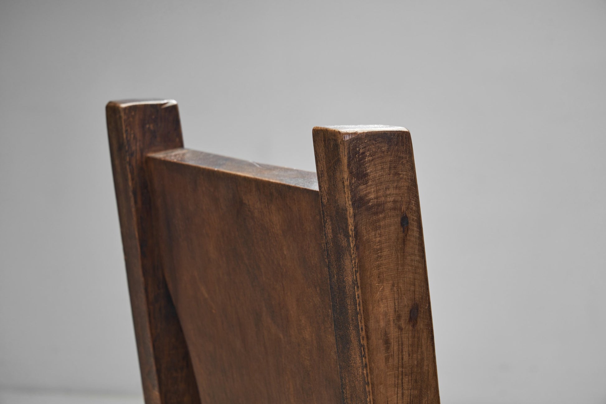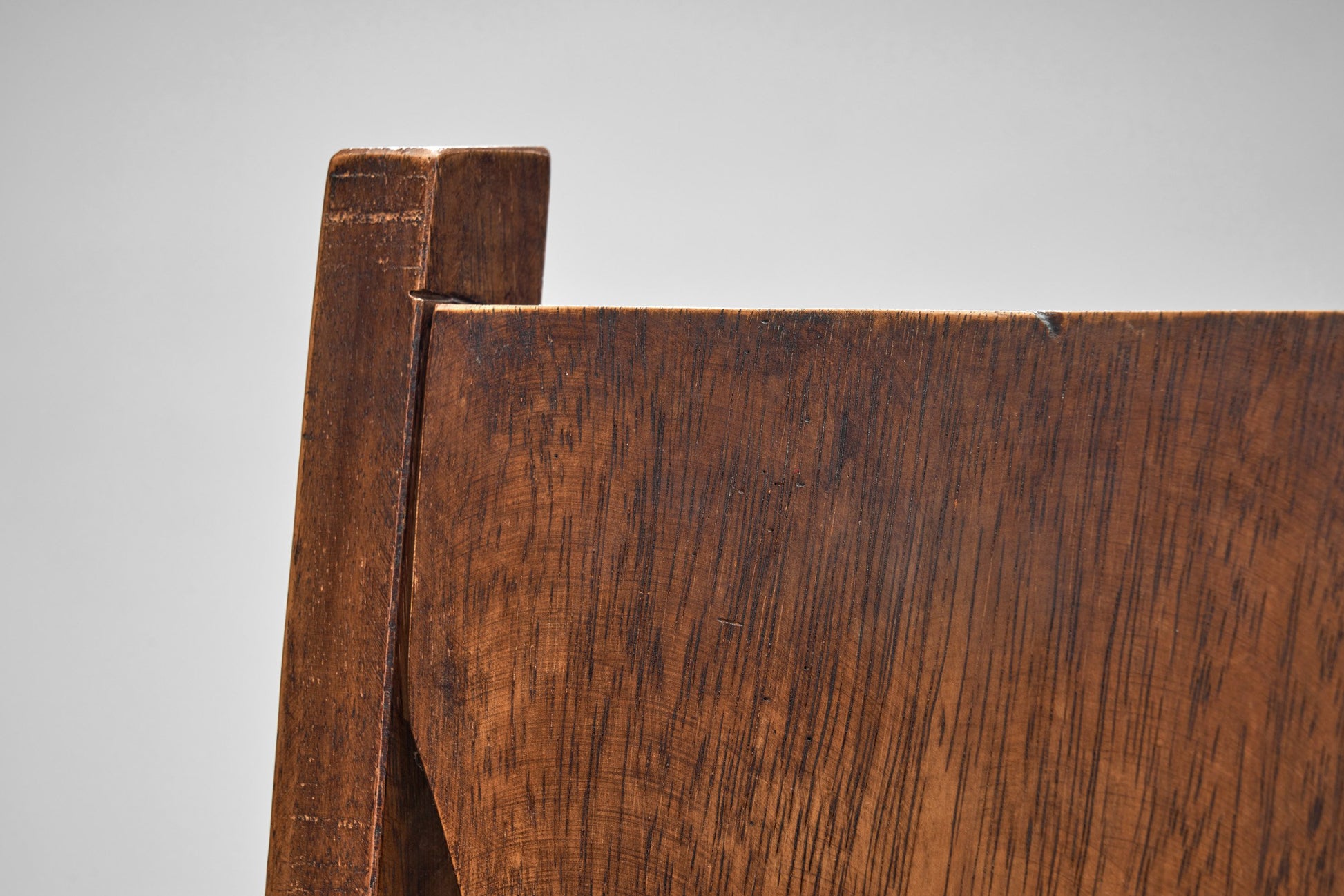 Price category: 2,500–5,000 USD / EUR. Set of four French dining chairs, 1950s, reflecting the modernist ethos of clean lines, functional forms, and skilled craftsmanship. The angular wooden frames, finished in a dark stain, highlight the natural grain while emphasizing geometric simplicity. High carved backrests soften the structure, while square stretchers reinforce stability and mirror the seat’s angular shape. Bold yet understated, these chairs balance elegance and utility, making them a timeless addition to any interior. In good vintage condition with age-consistent wear. Dimensions: 42 × 53.5 × 110 cm; seat H 49.5 cm; seat D 44 cm (16.5" × 21" × 43.3").