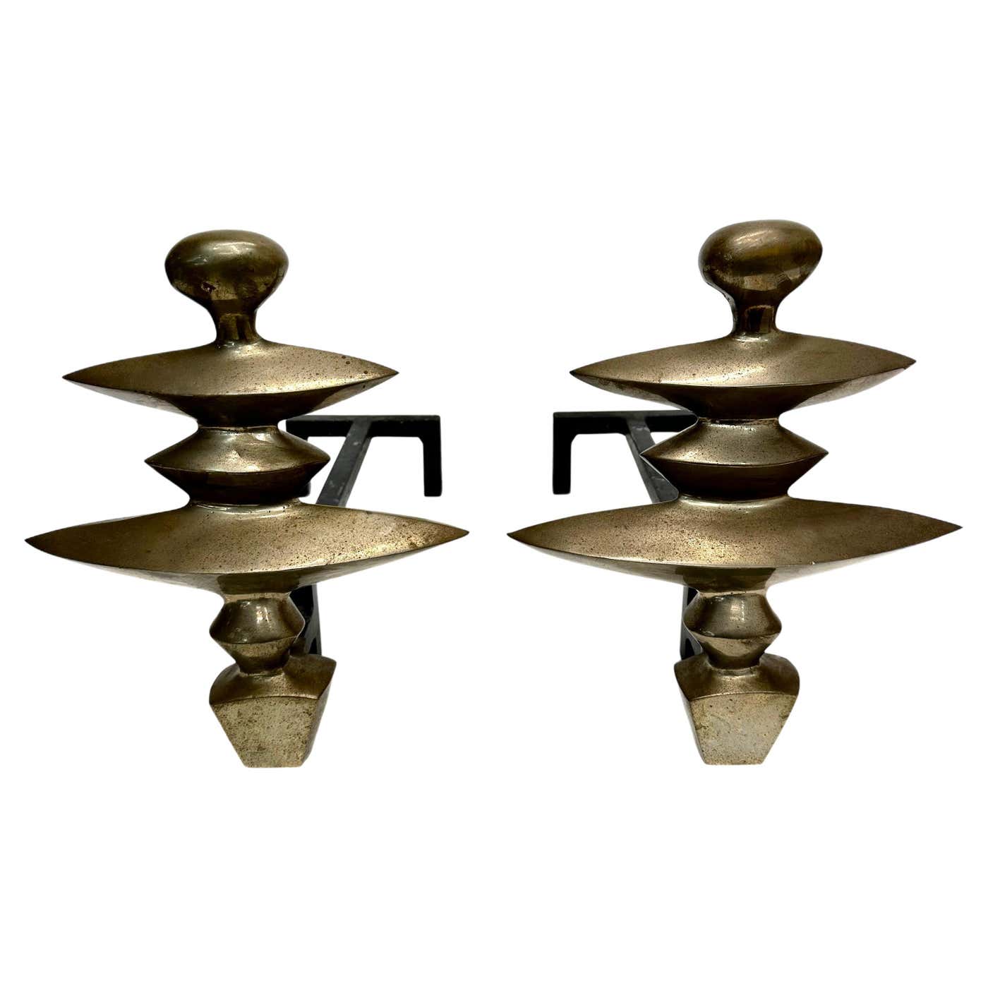 Alberto Giacometti, bronze and iron andirons, after the 1930s design from the Nelson Rockefeller Collection. Likely from a small unsigned edition produced by Excalibur Bronze in the late 1970s. Provenance: estate of a Coca-Cola executive, with interiors by Atlanta decorator Stan Topol. Sculptural and functional, these andirons reflect Giacometti’s distinctive modernist vocabulary.