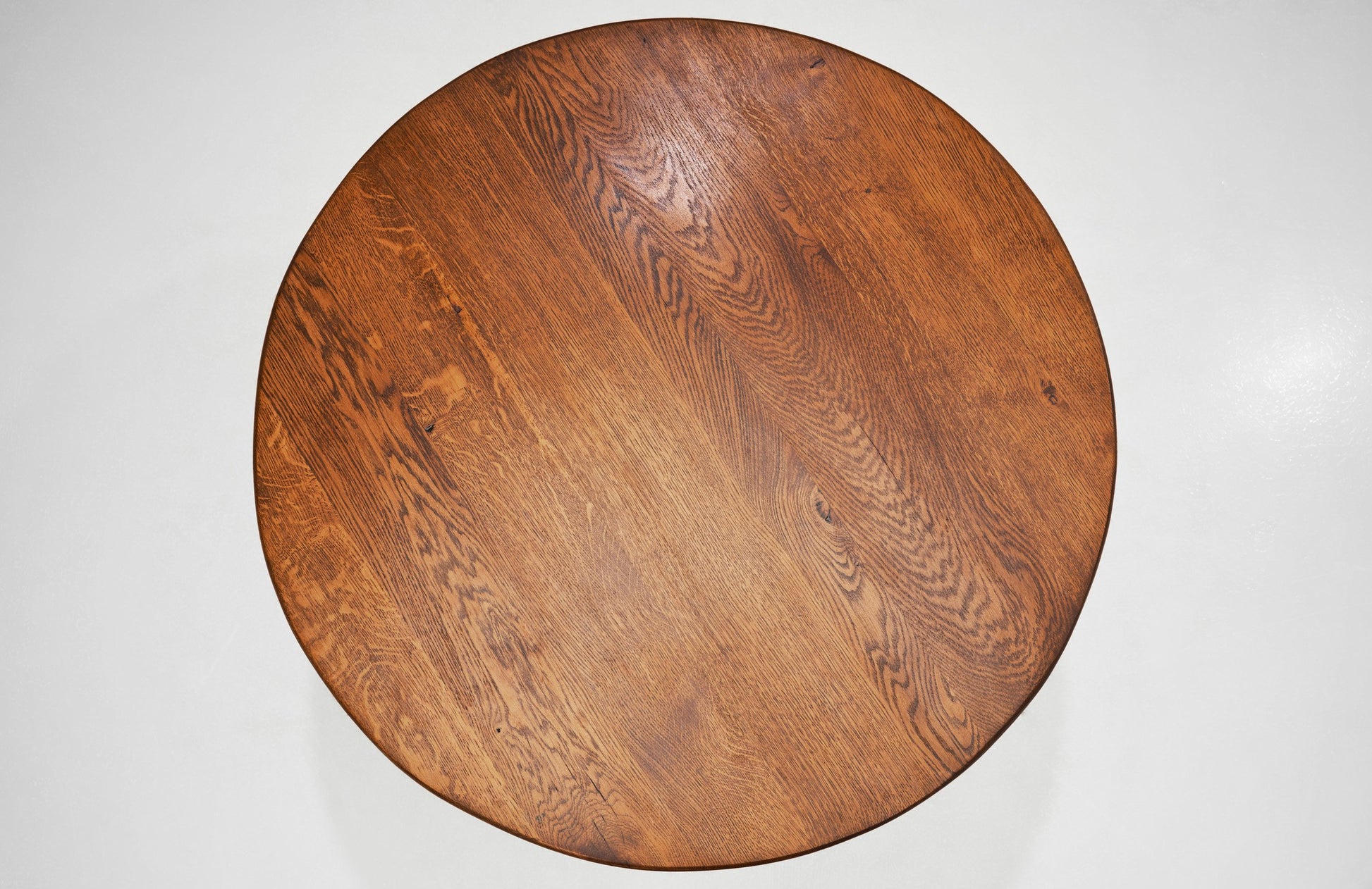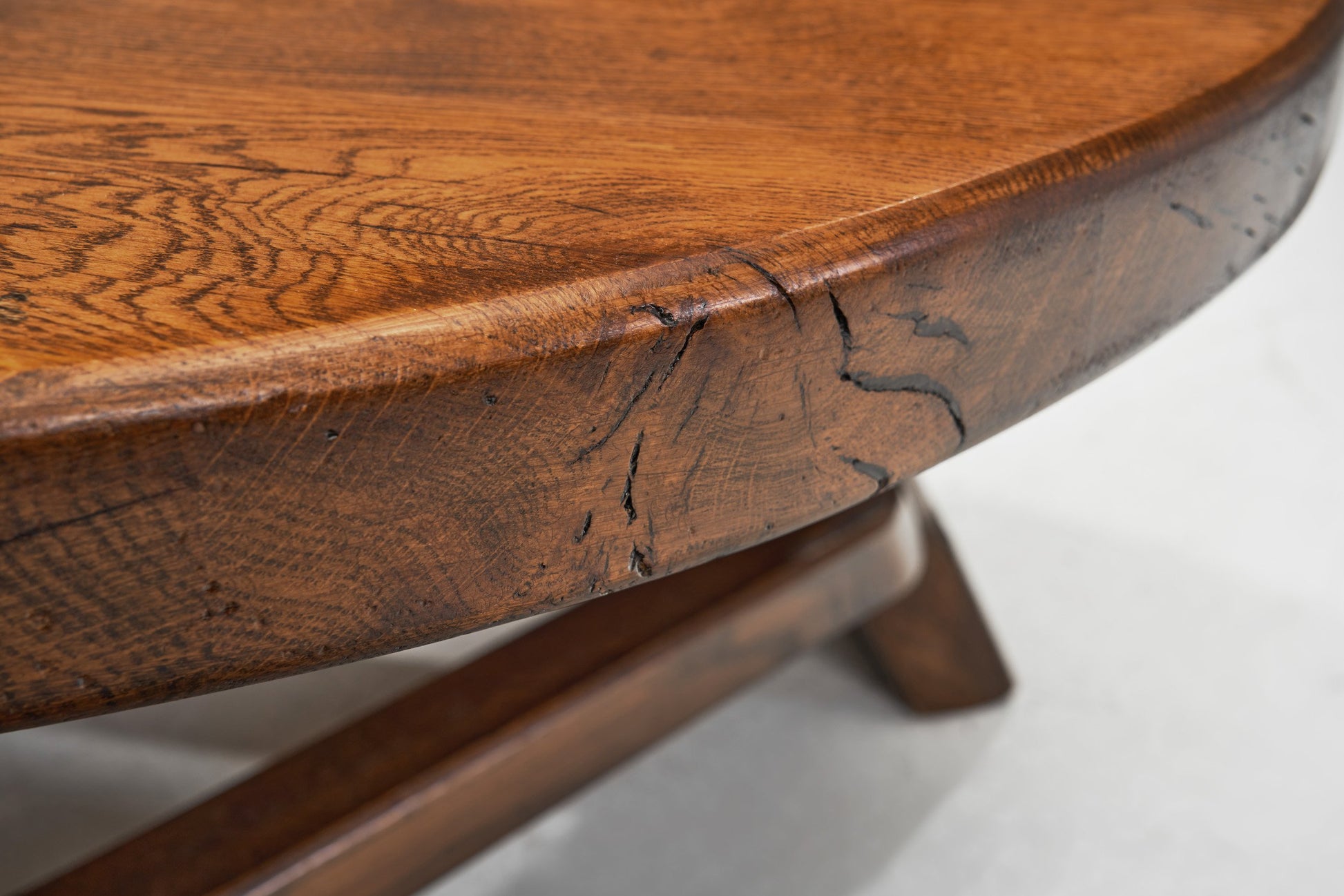 Price category: 2,500–5,000 USD / EUR. Brutalist oak coffee table, mid-20th century, showcasing the movement’s raw aesthetic and functional clarity. The design centers on three angular legs joined by stretchers, forming a stable triangular base that balances strength and geometry. Crafted from solid oak, its distinct grain and warm tone highlight the material’s natural beauty while enhancing the minimalist Brutalist form. Durable and timeless, the table develops rich patina with age, making it both functional and sculptural. In very good vintage condition with minor wear. Dimensions: 99.5 cm Ø × 43 cm H (39.2" Ø × 16.9" H).