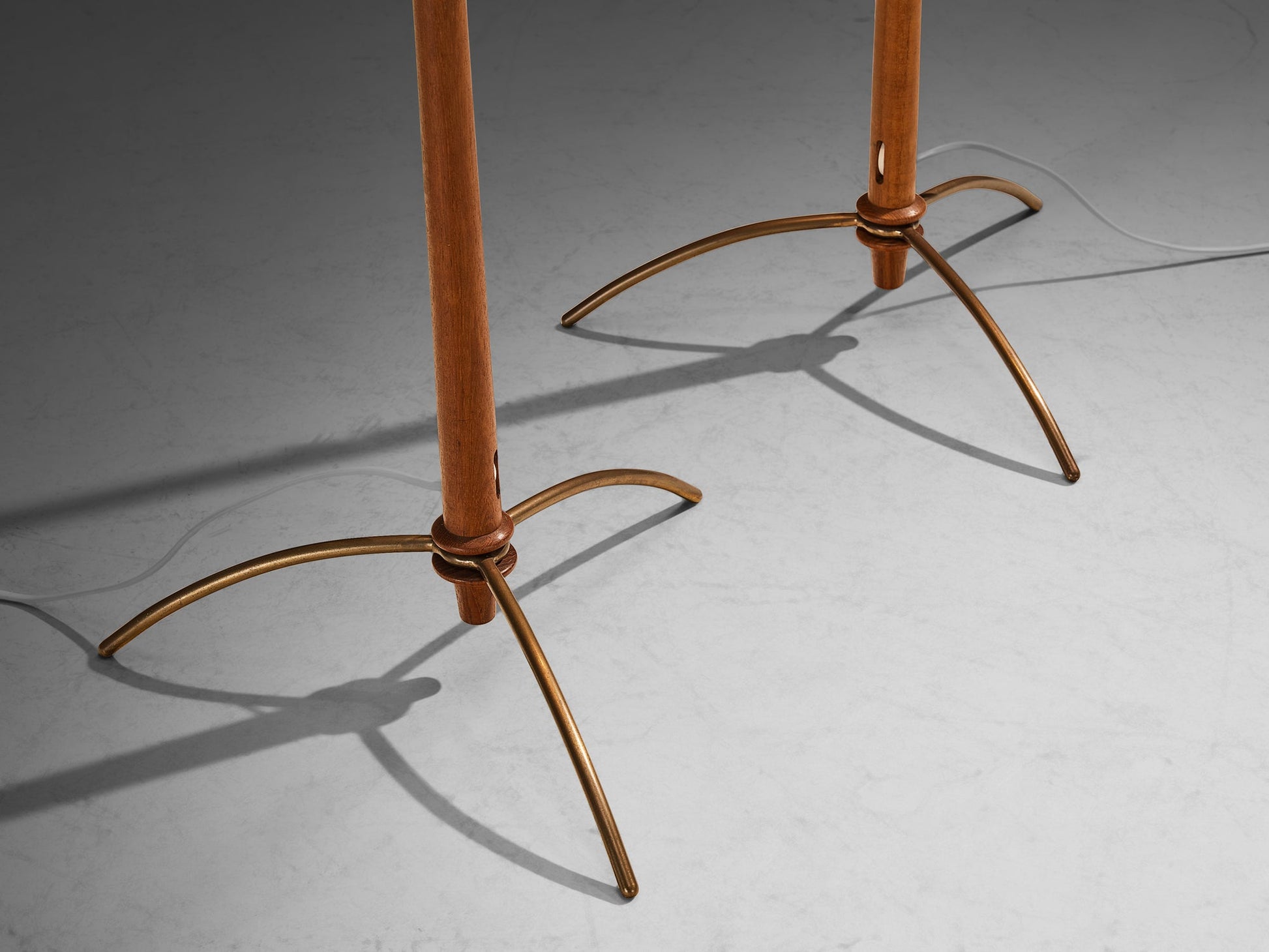 Hans-Agne Jakobsson for Hans-Agne Jakobsson AB, pair of “G45” floor lamps, Sweden, 1960s. Each lamp features a conical woven cane shade on a slim teak stem, supported by a brass tripod base of bent rods. The design reflects the purity and elegance of Scandinavian modern lighting. Jakobsson (1919–2009), originally trained as a carpenter and architect, founded his company in 1951 and became known for softly glowing, glare-free fixtures inspired by Poul Henningsen and Alvar Aalto. This pair highlights his refined use of natural materials and mastery of lighting effects.