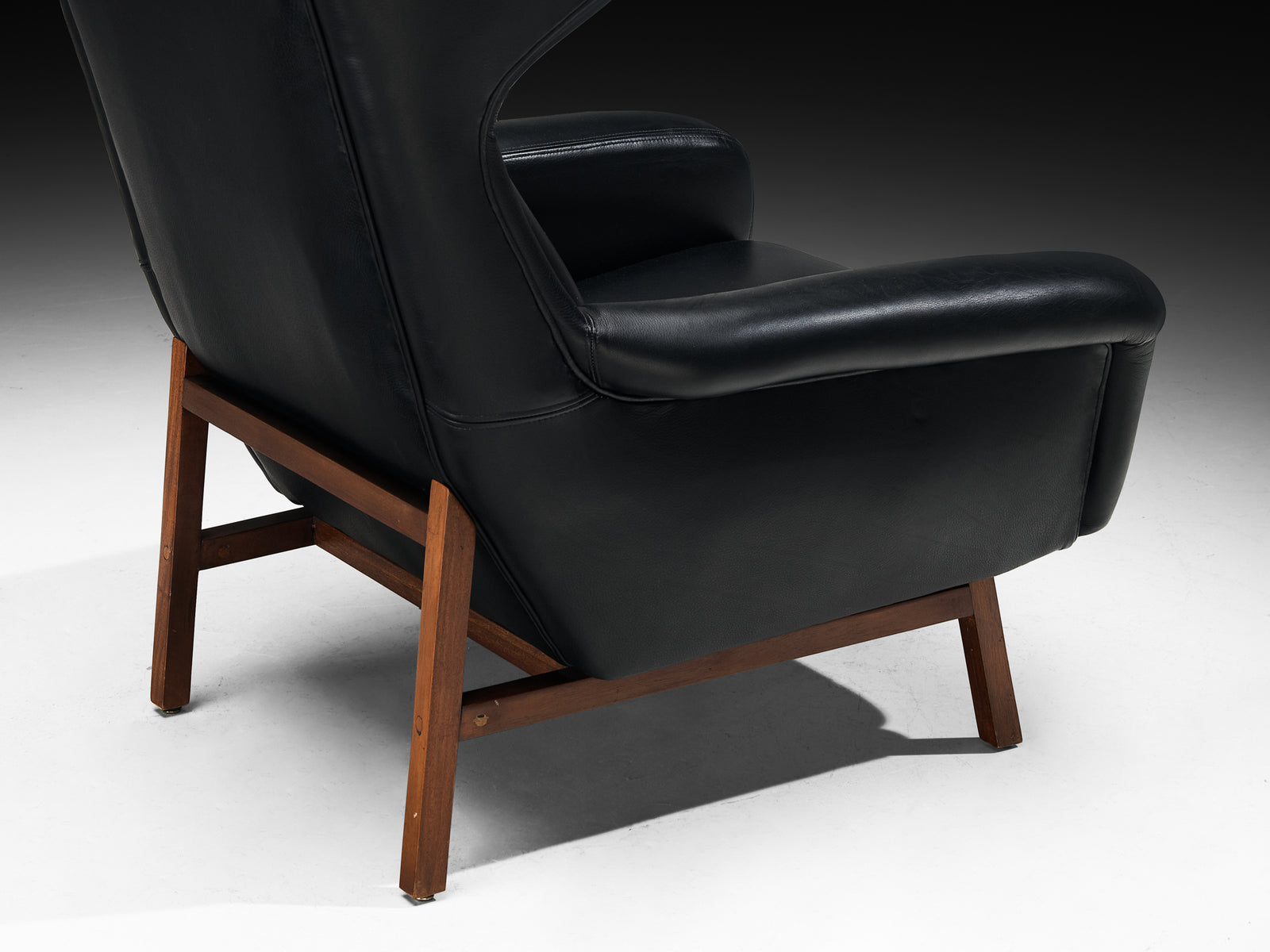 Italian Pair of Wingback Lounge Chairs in Black Leather and Mahogany