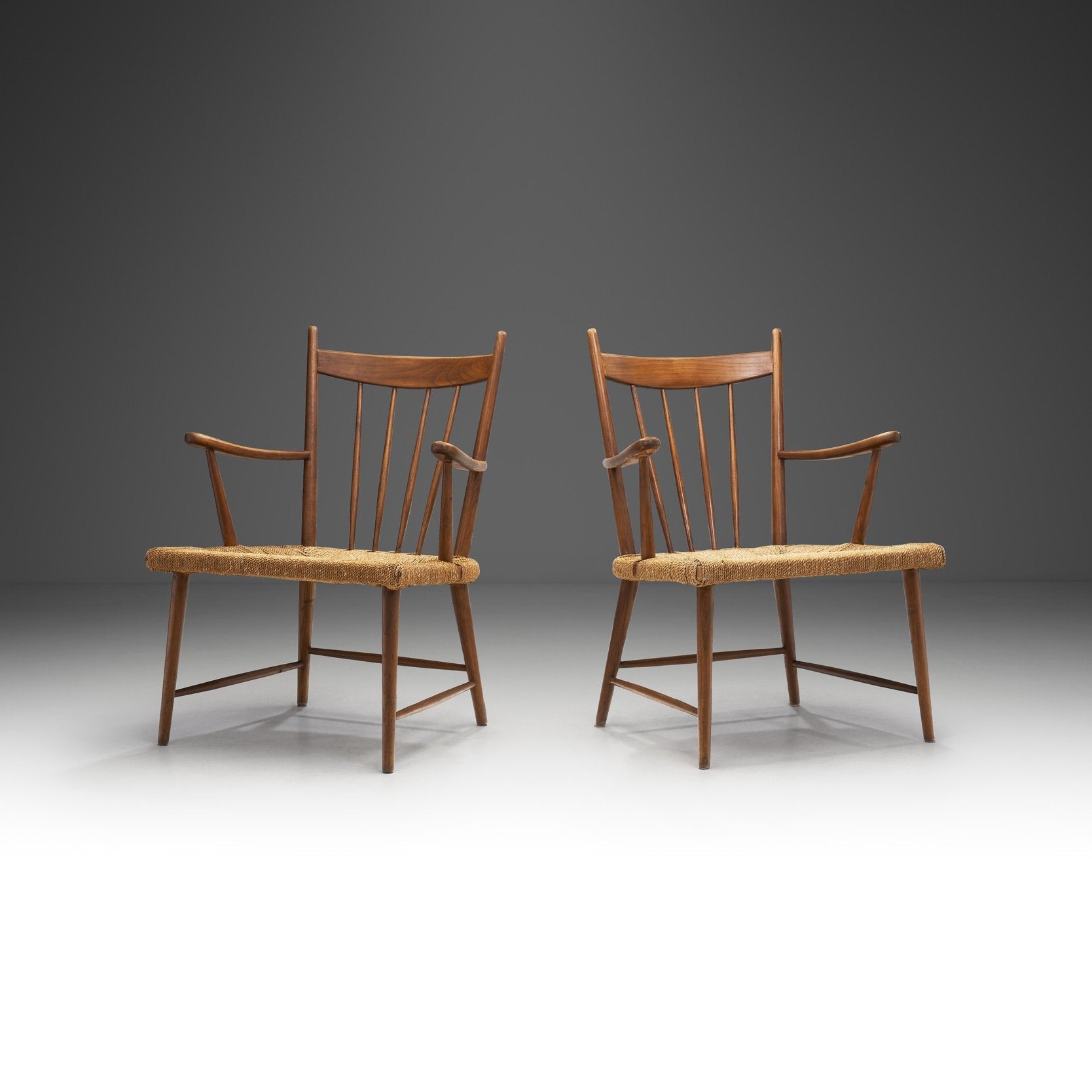 Price category: 5,000–7,500 USD / EUR. Pair of Danish Modern teak slatback armchairs with woven Danish paper cord seats, 1940s–50s. Exemplifying the era’s focus on function and minimalism, the design recalls Shaker clarity while evoking wabi-sabi and Japandi aesthetics. Six slender spindles form airy backrests, with sculpted arms, curved top rails, and refined joinery adding elegance. The warm teak frames contrast with the durable, tightly woven Danish cord, a signature material of mid-century design. In good vintage condition with light wear. Dimensions: 63 × 61 × 85.5 cm; seat H 41 cm; arm H 61 cm (24.8" × 24" × 33.7").